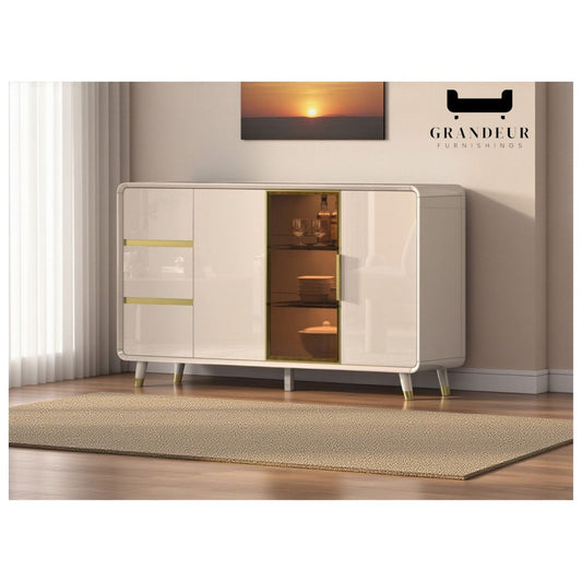 Elegant Gloss Light Khaki Side Cabinet with Gold Chrome Plated Accents & Tempered Glass