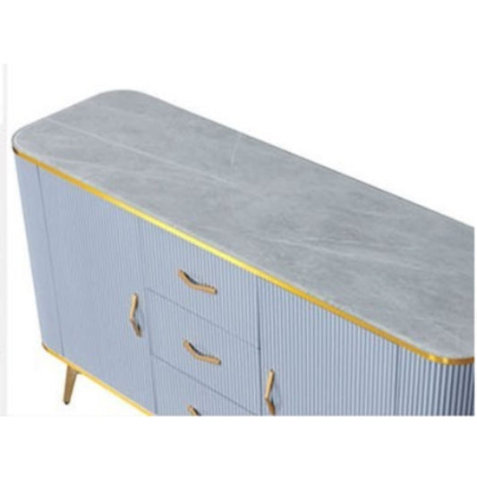 Stylish Blue Ribbed Side Cabinet with Gold Accents and Tempered Glass Top
