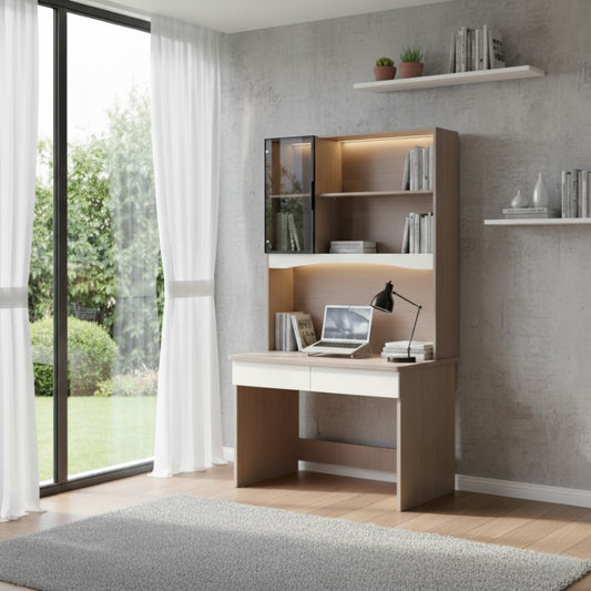 Modern Study Desk | Computer Workstation with Glass Cabinet, Bookshelves & 2 Drawers