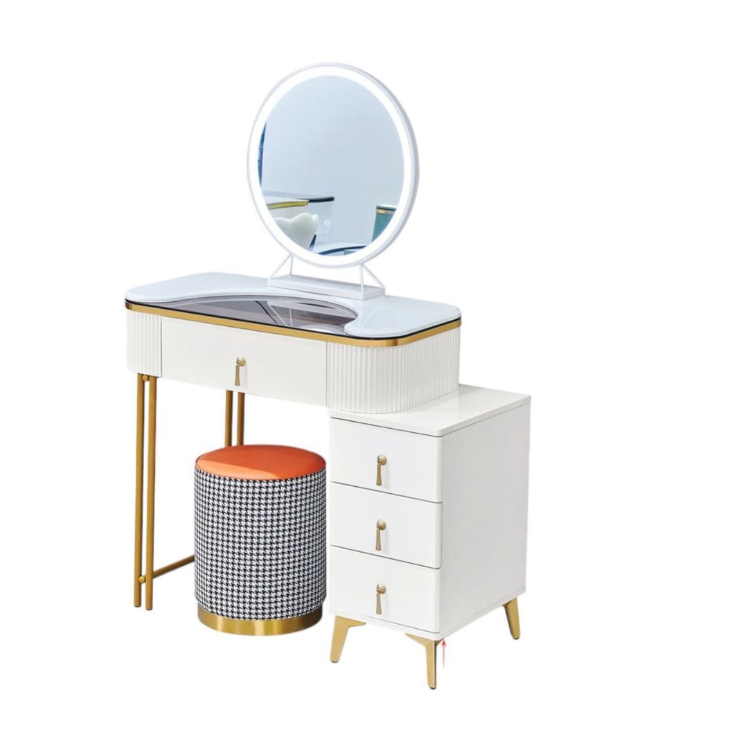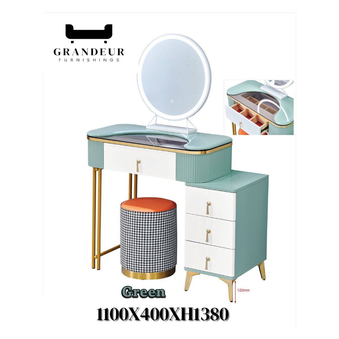Enhance your vanity space with this chic and modern dressing table. Designed to suit various room aesthetics, this sleek table is available in three elegant colors: green, grey, and white. Featuring a round mirror, storage drawers, and a matching stool, it combines functionality and style.