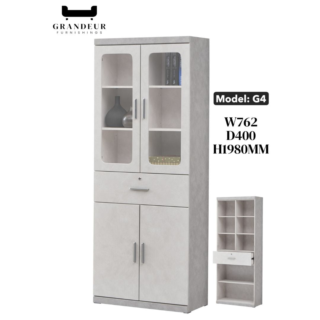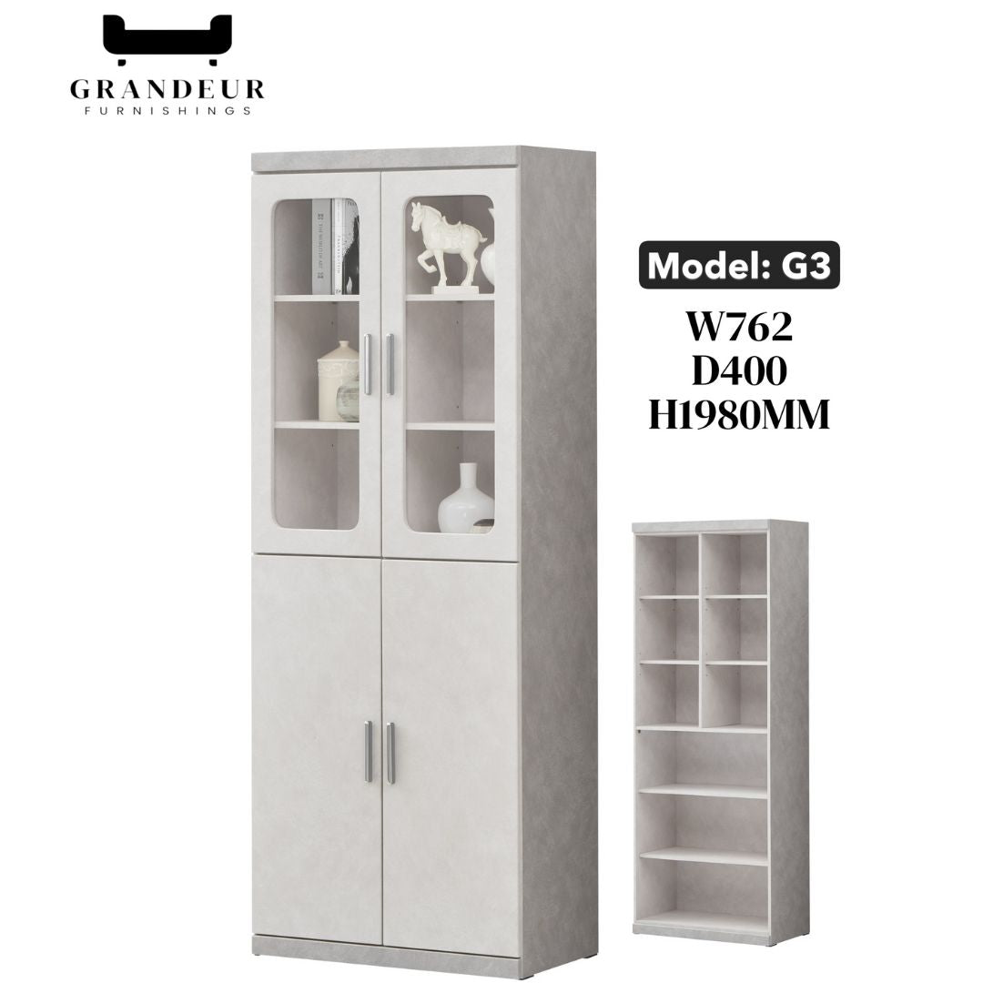 Bring refined sophistication and smart organization to your space with this elegant light grey bookcase display cabinet. With a balanced combination of glass-front cabinets, open shelving, and hidden storage, it's the ideal solution for stylish living rooms, home offices, or executive suites.