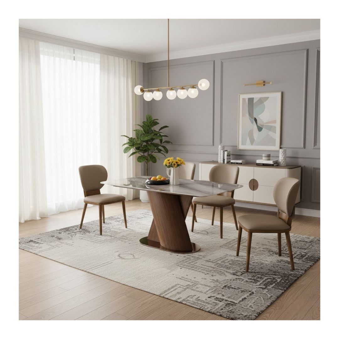 Transform your dining room with this sophisticated marble dining set, featuring a stunning marble top with soft tones, complemented by a solid ash wood base and stainless steel accents. The set comes with luxurious leather chairs, offering both comfort and style to elevate your dining experience.